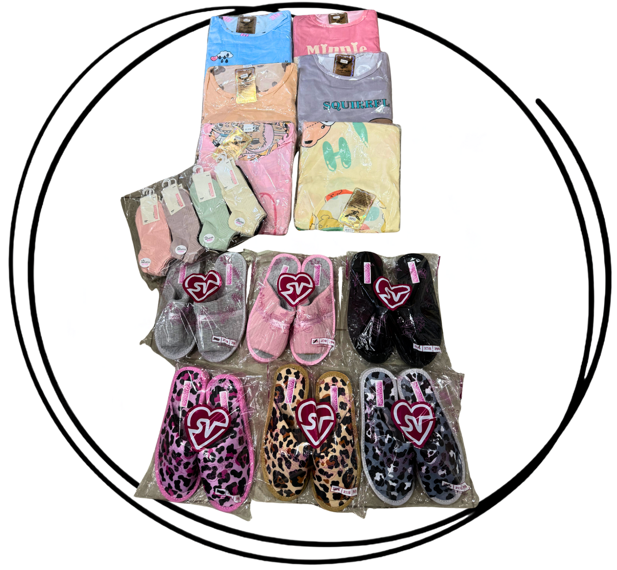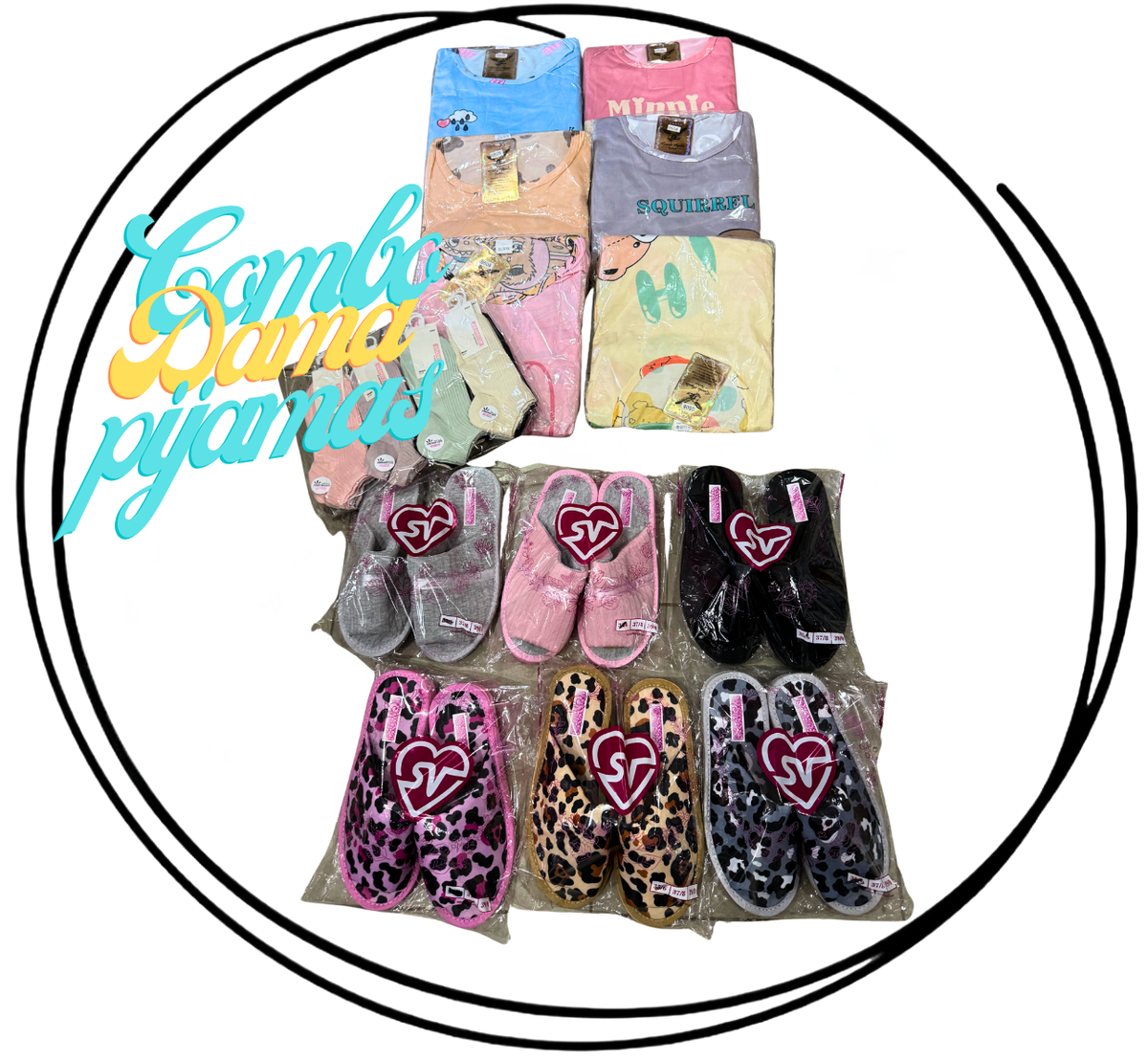 6 Pijama dama verano 3 piezas sublimados premium  T.S/XXL , Pantufla dama verano jersey print SV punta abierta T.35/40 , 3 pantuflas dama Morley verano T 35/40  y 12 zoquetes dama Amanecer doble hilado algodón de verano, todo talles y diseños/colores surtidos.  Todo de excelente calidad 🥰