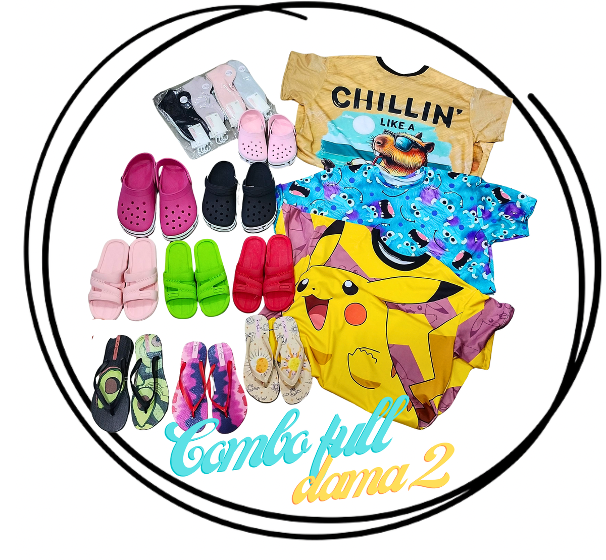 3 remerones personajes oversized premium, 3 sandalias dama símil cierre premium talles 35 al 40, 3 zuecos lisos con banda talles del 35 al 40, 3 ojotas slim estampadas dama talles 35 al 40 y 12 zoquetes dama Amanecer doble hilado algodón de verano, todo talles y diseños/colores surtidos. Todo de excelente calidad 🥰