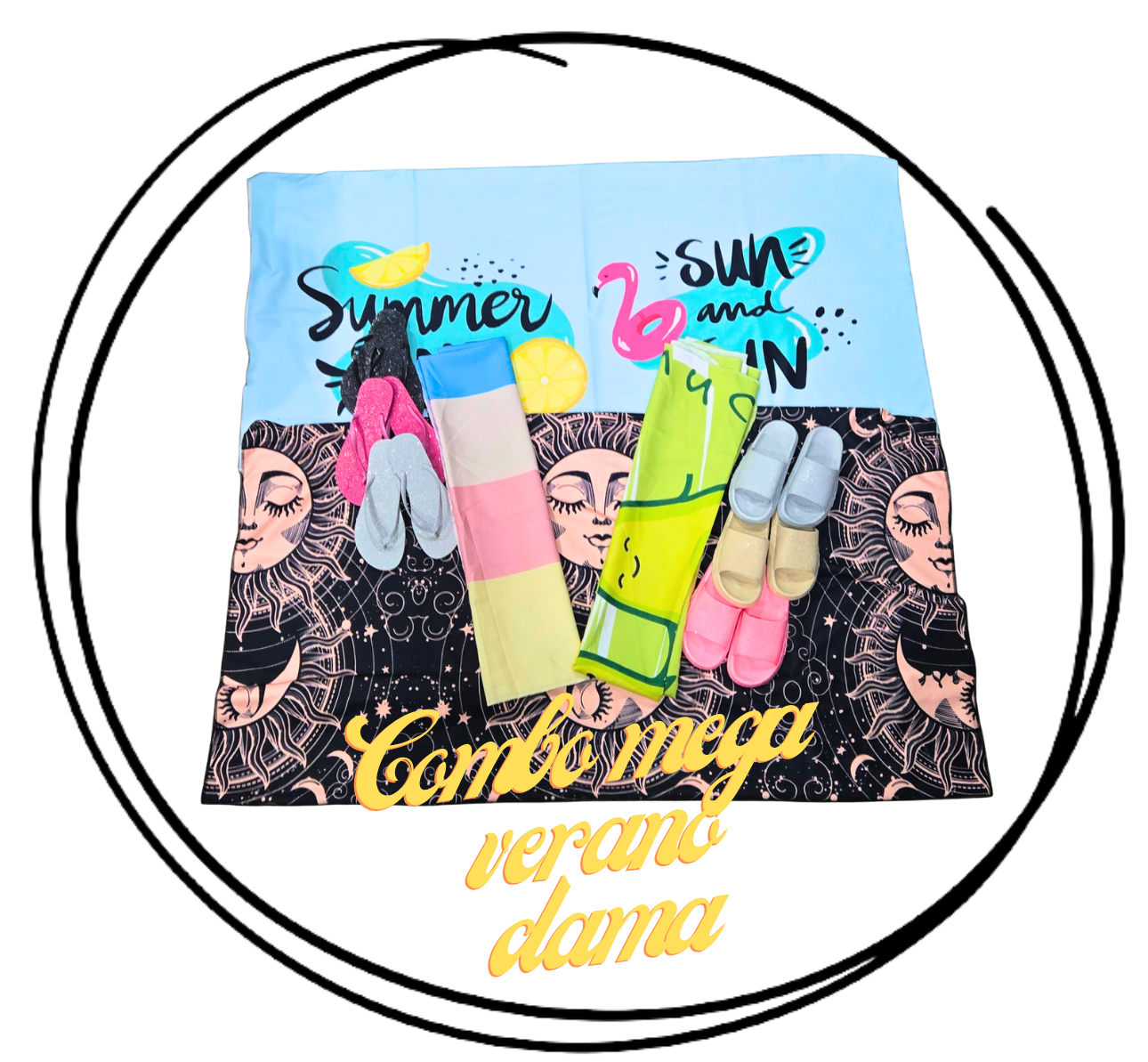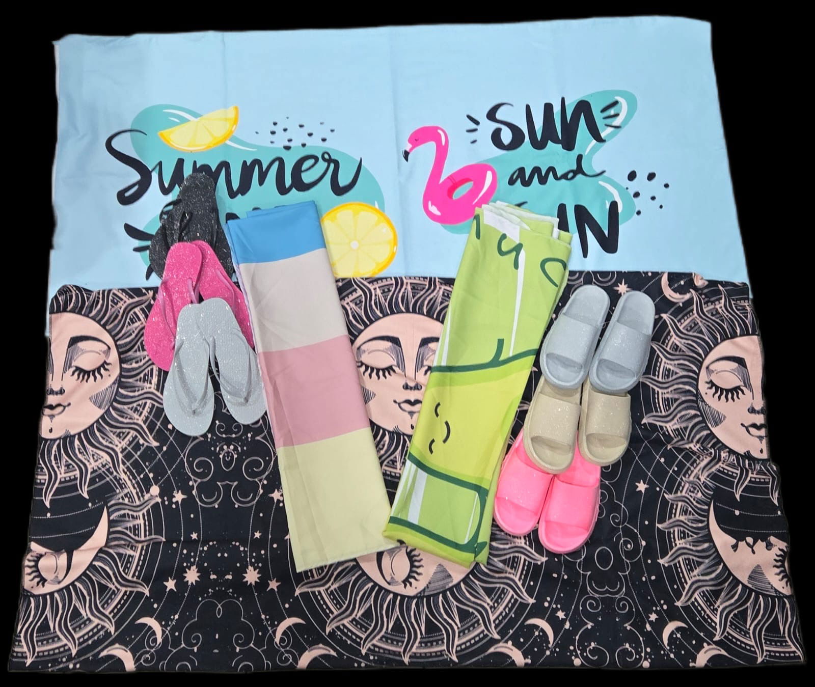 2 maxi lonas playeras de 1,5 mts x 1,5 mts, 2 mega toallones playeros 1,5 mts x 1,5 mts, 3 gomones Maia con glitter T.35/40 , 3 ojotas slim dama con glitter T 35/40 todo talles y diseños/colores surtidos. Todo de excelente calidad 🥰