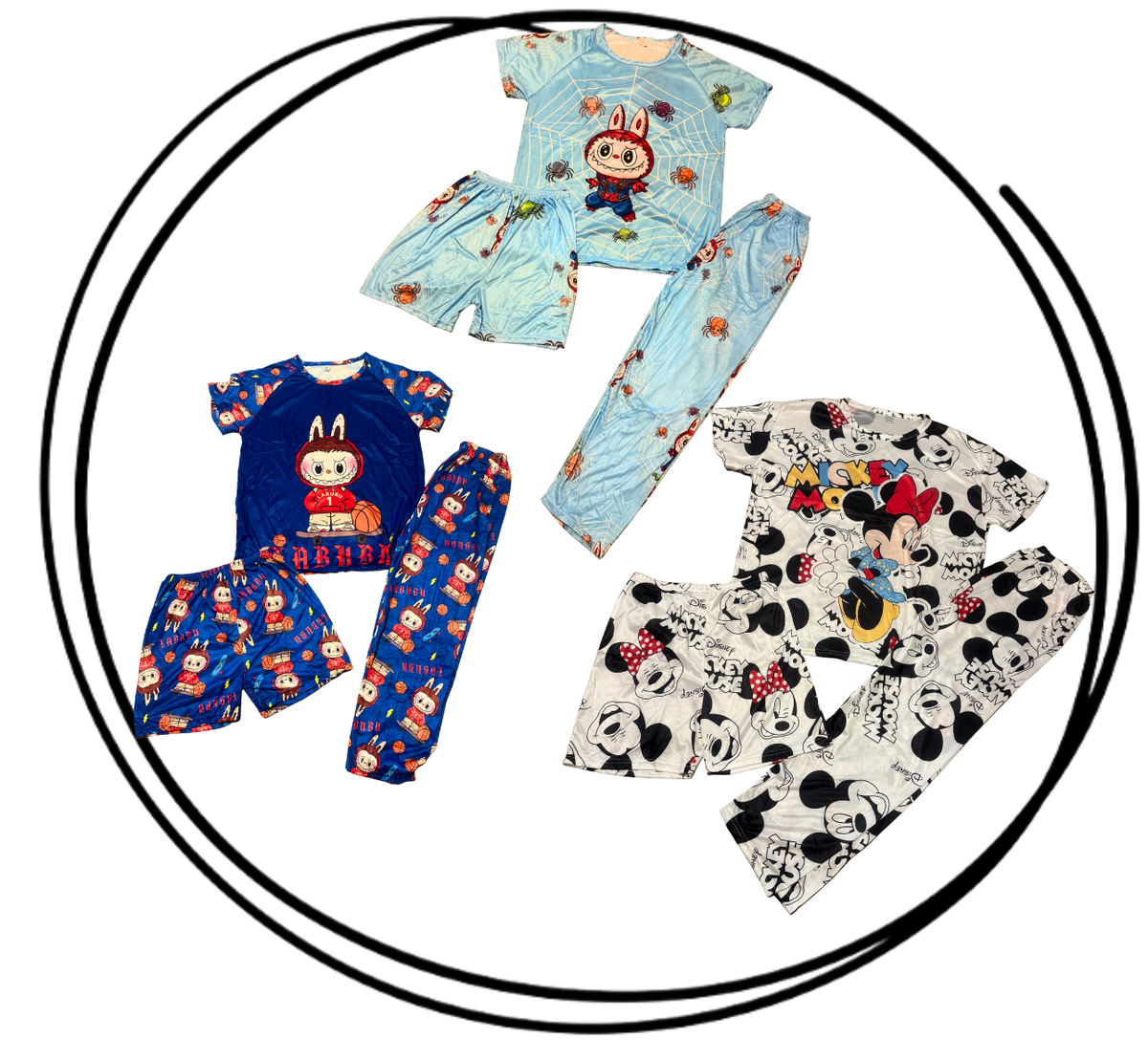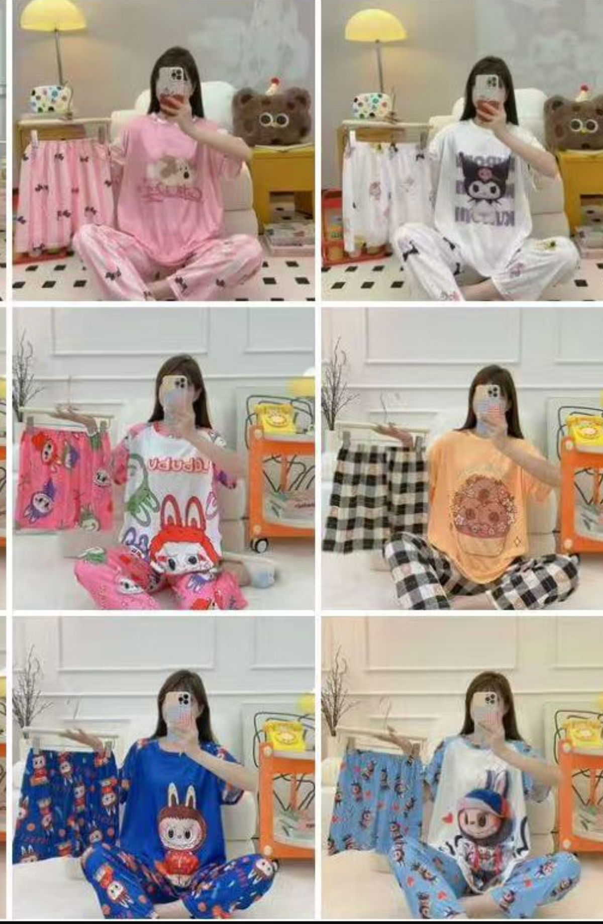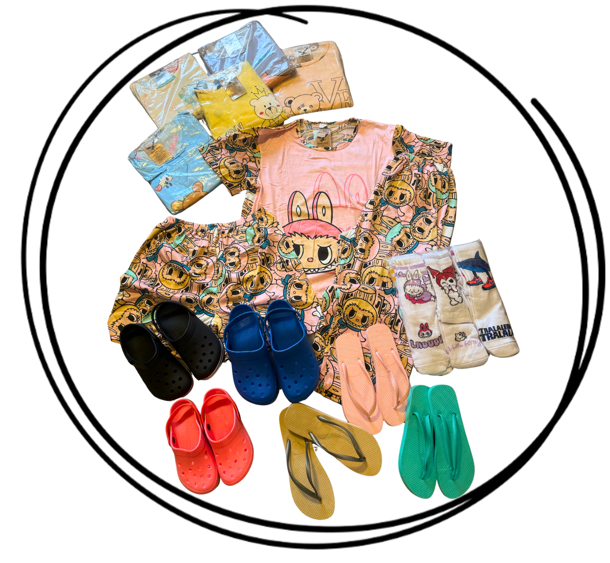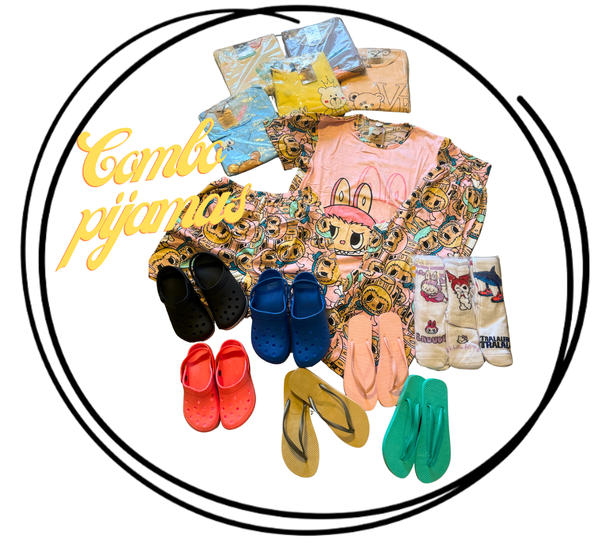 Combo emprendedor 6 pijamas dama 3 piezas premium talles del M al XXL, tela súper fresca, sublimados, 3 zuecos unisex talles 34/40, 3 ojotas slim dama lisas de colores talles 35/40 y 12 medias doble hilado algodón de personajes, todo talles y diseños/colores surtidos.