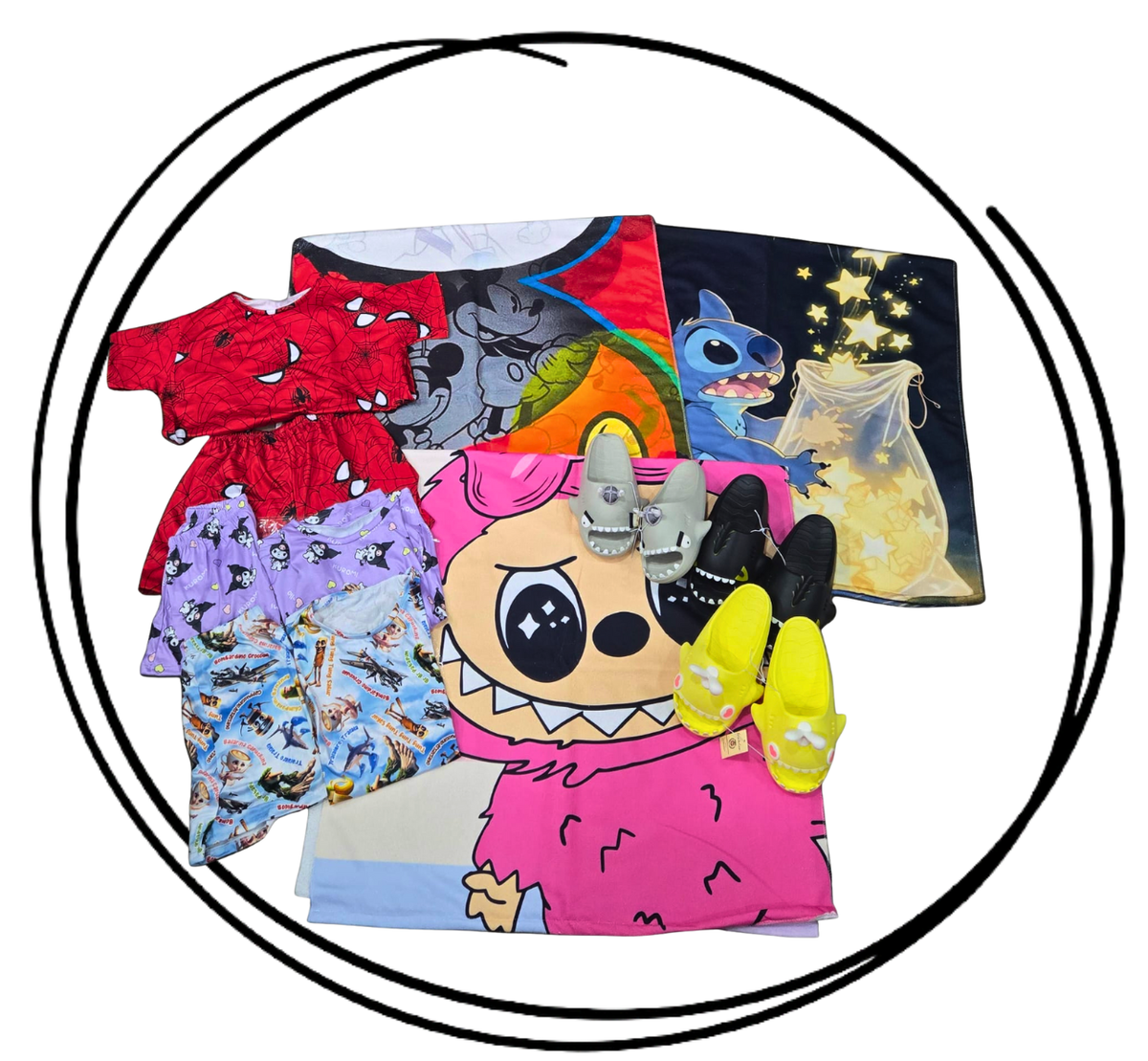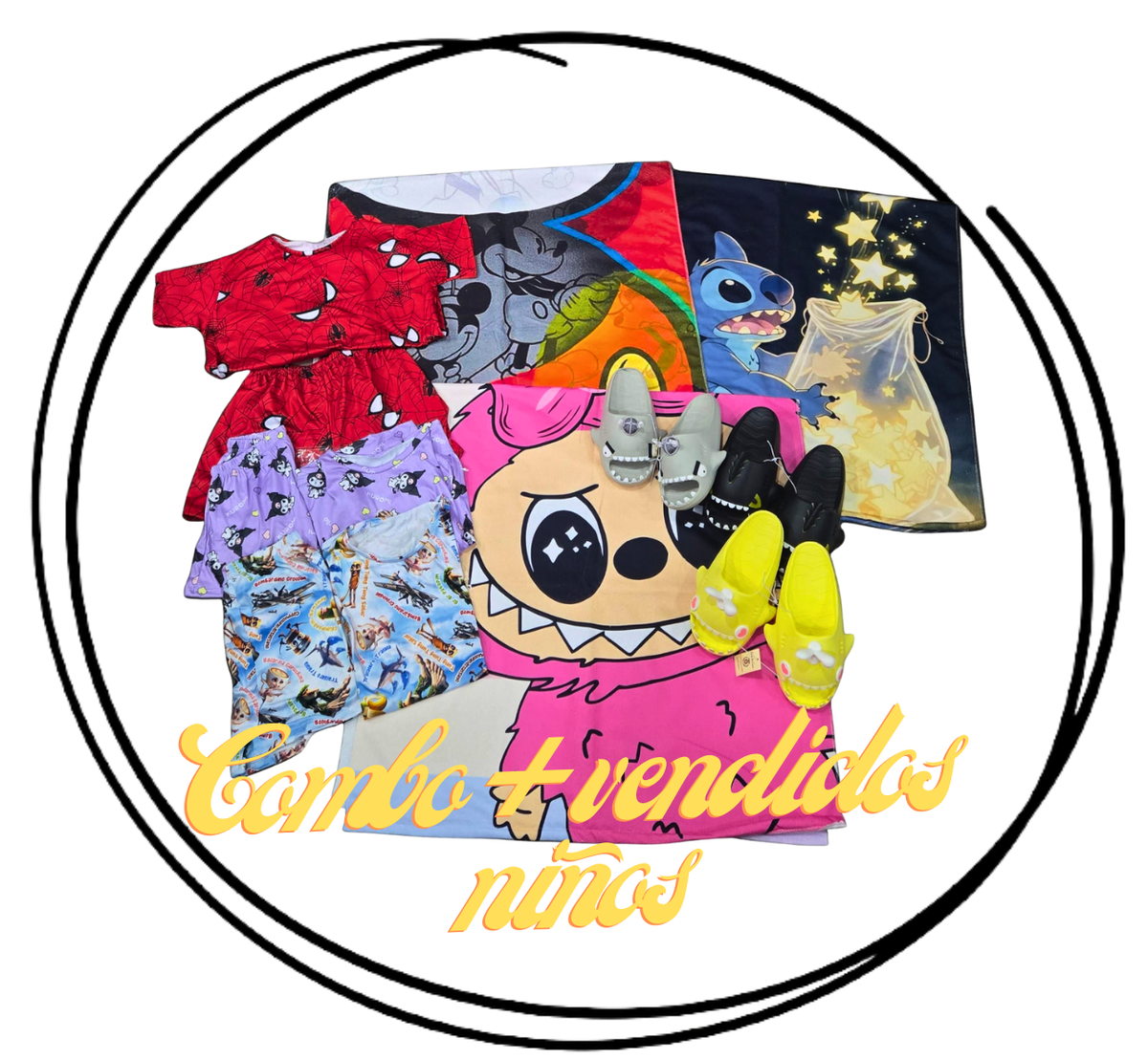 Combo emprendedor más vendidos niños incluye: 3 pijamas niños modal soft full estampas talles del 4 al 14, 3 Sharklas importadas con pines removibles 27/34 y 3 toallones playeros. Todo de excelente calidad. Talles y diseños surtidos.