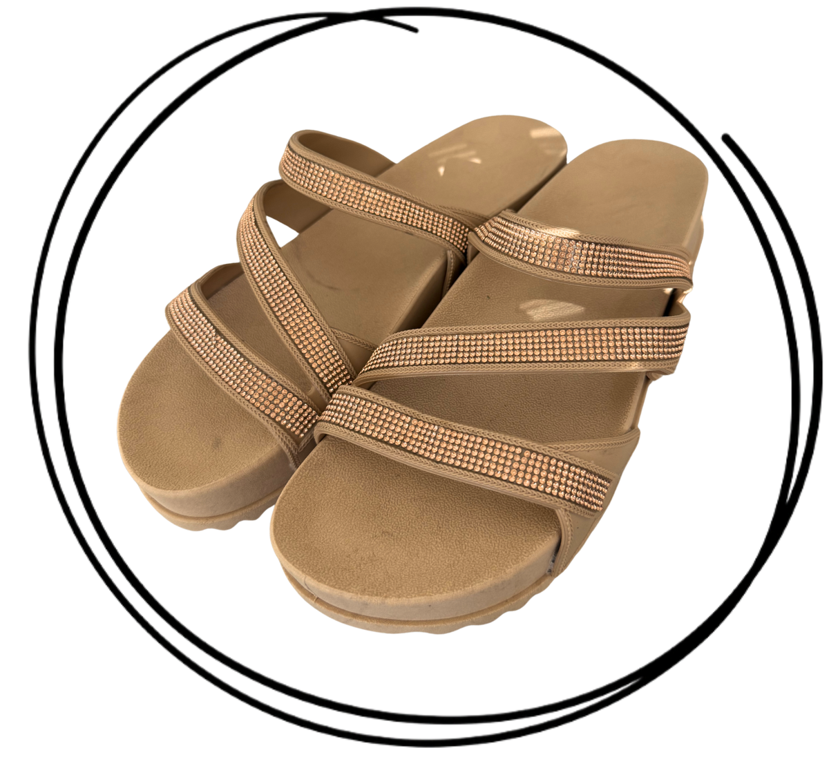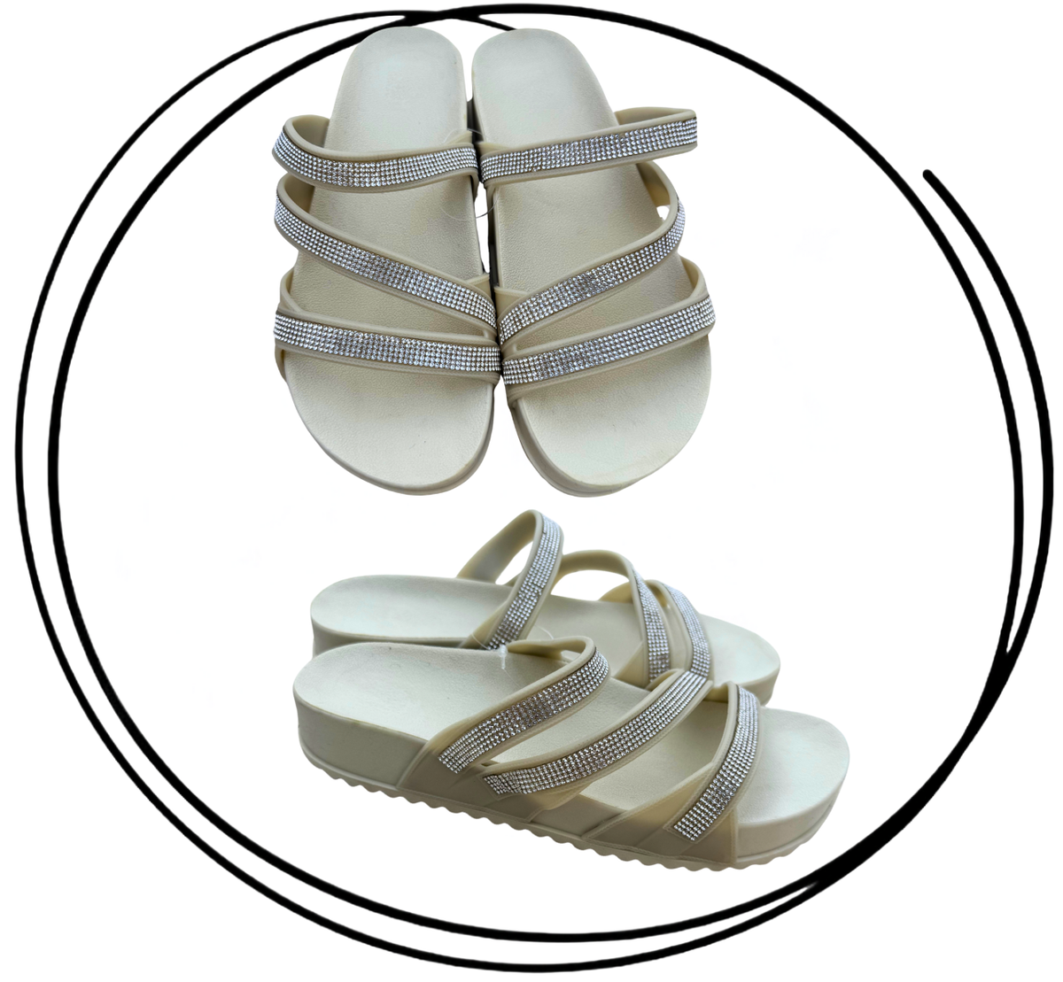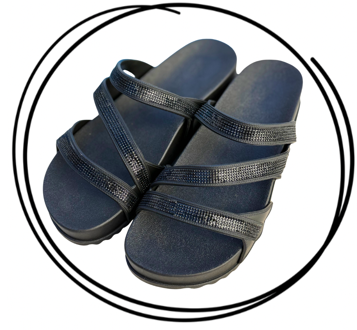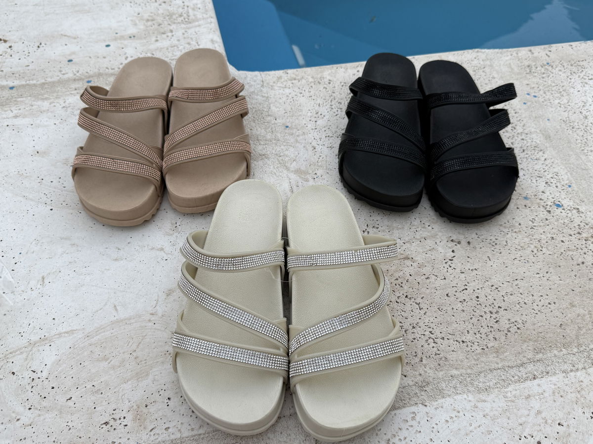 Fabricadas en PVC full plastic de alta calidad, ofrecen durabilidad y resistencia para el uso diario. Su diseño con tiras con brillos aporta un toque original y atractivo, dando el toque final con sus tiras cruzadas que aportan gran sujeción y confort.