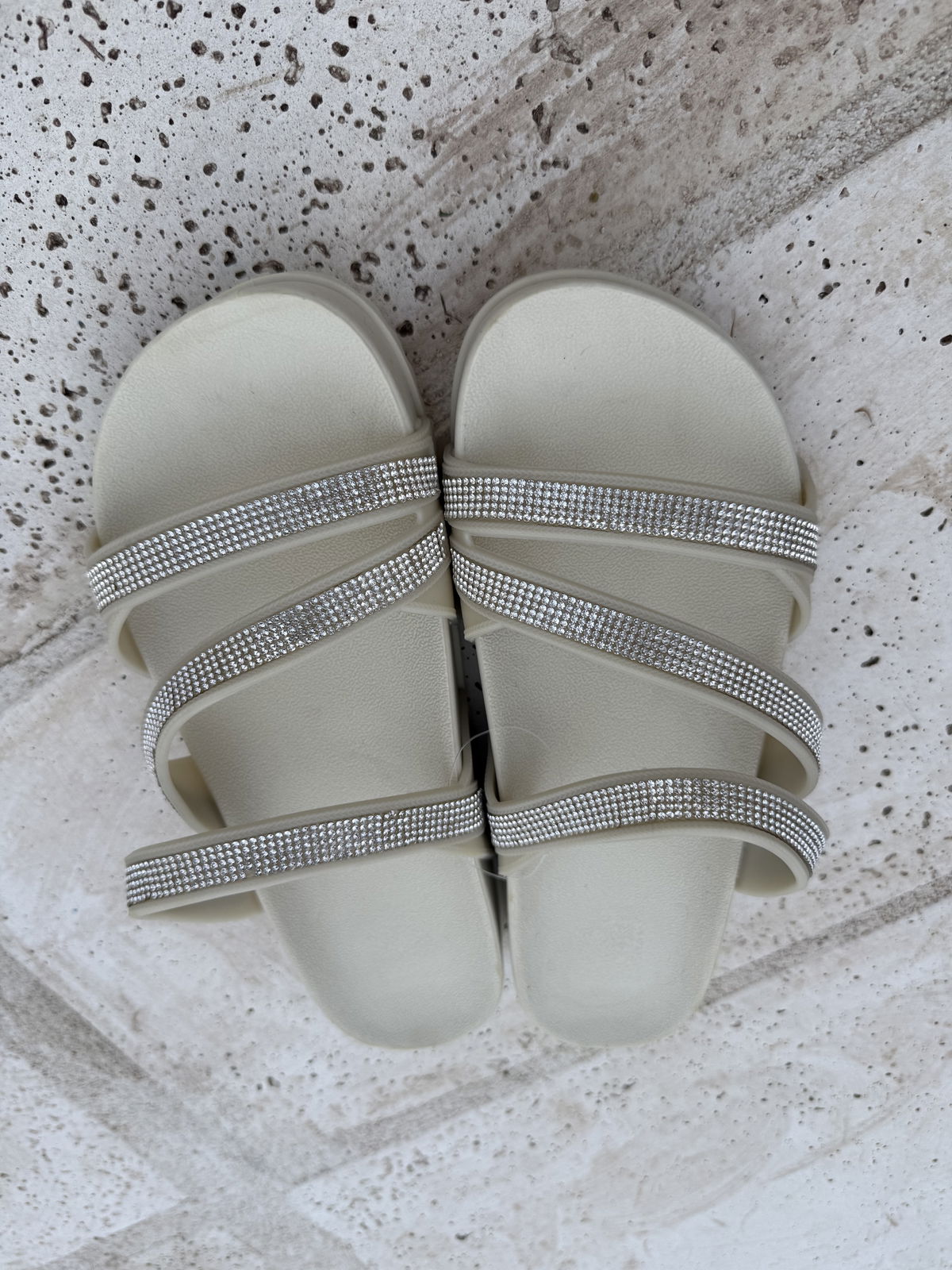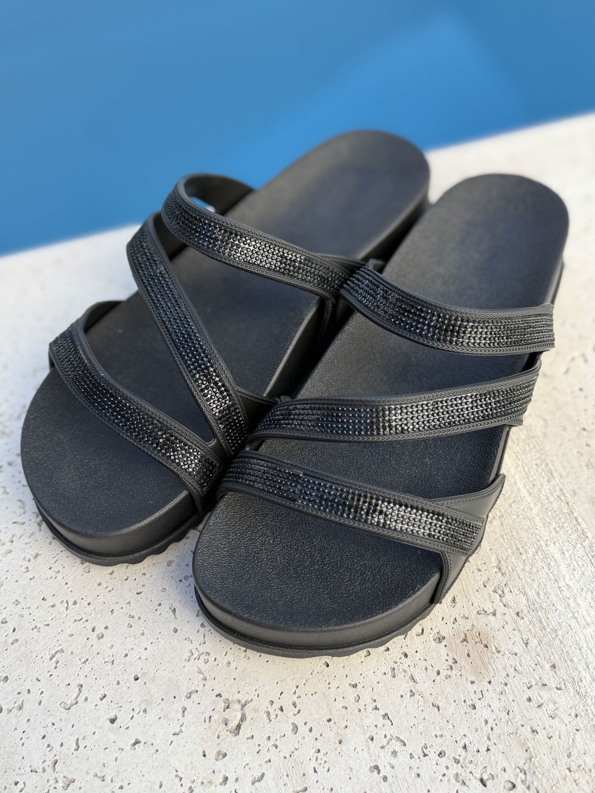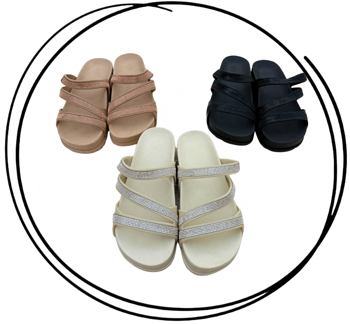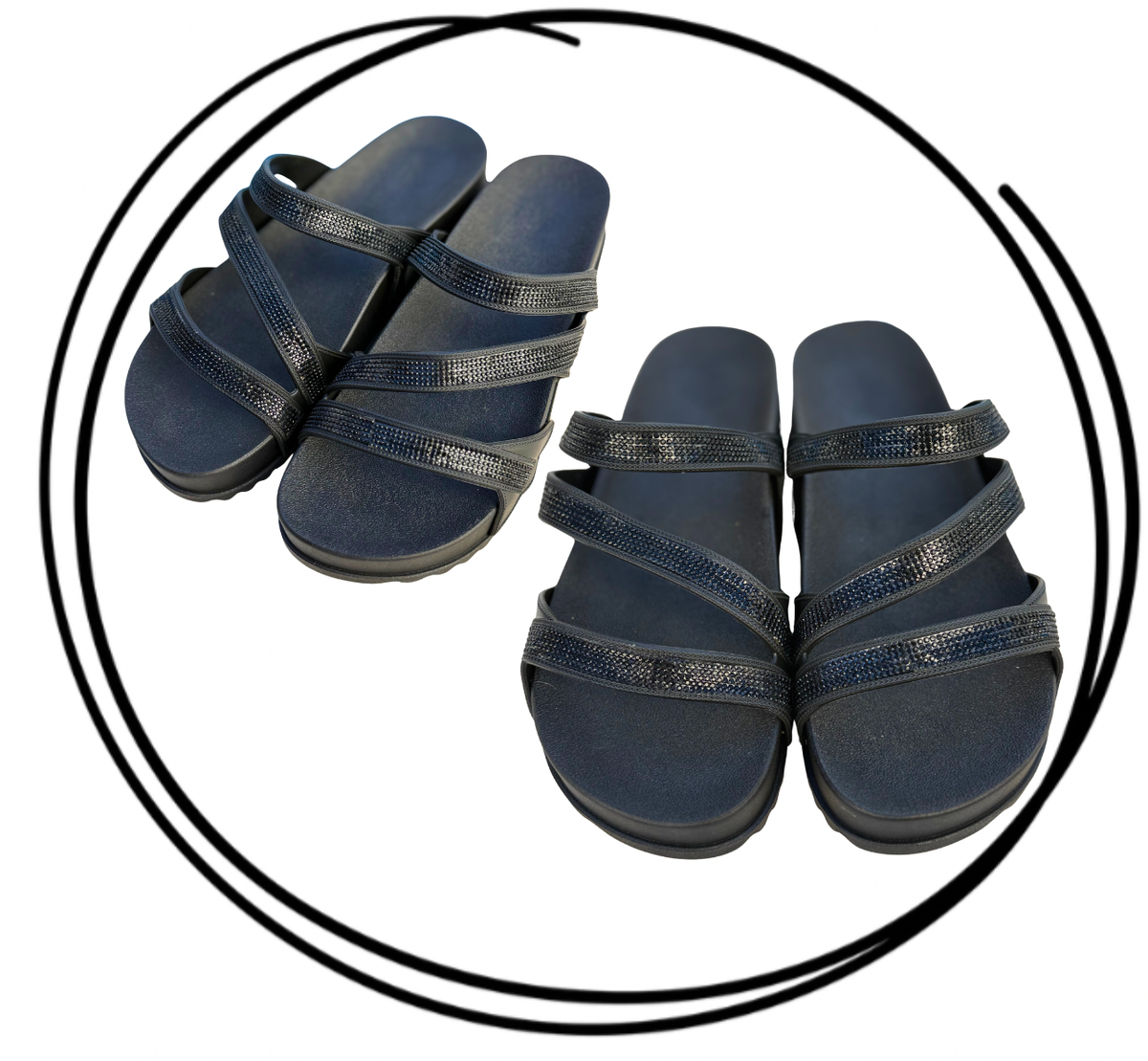 Fabricadas en PVC full plastic de alta calidad, ofrecen durabilidad y resistencia para el uso diario. Su diseño con tiras con brillos aporta un toque original y atractivo, dando el toque final con sus tiras cruzadas que aportan gran sujeción y confort.
